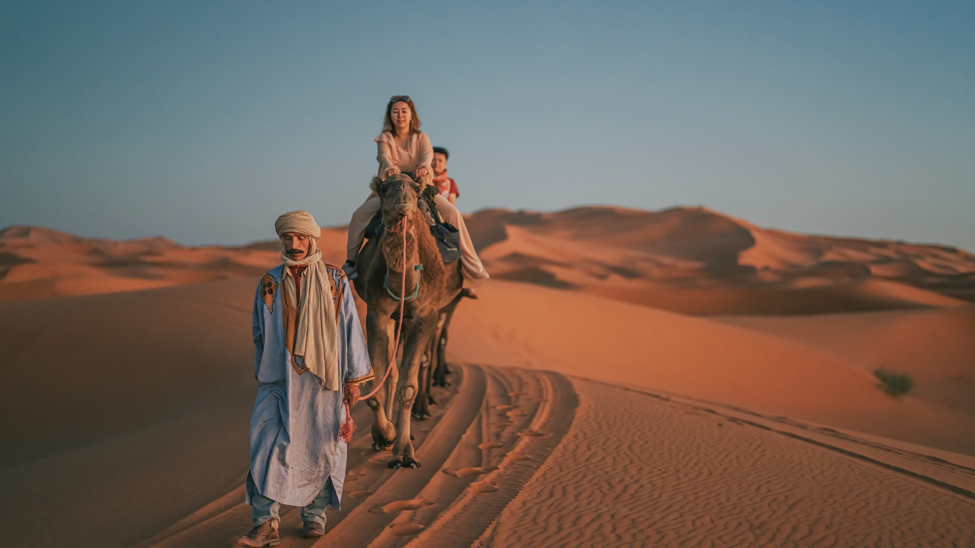 Breakfast at the hotel.Continue our journey around the dunes of Erg Chebbi.Discover how and where nomadic families live, spectacular landscapes, and small desert towns. Departiremos, we will live and provide food to a typical Berber family. Closely know their customs and way of life. After the visit, we, the people of Khamelia, the native people of Mali, will enjoy a nice concert of Gnawa music. Back at the hotel, waiting for us to leave the camels on a route of almost half an hour to get to the heart of the desert and watch the beautiful sunset. While enjoying an exquisite dinner, Moroccan tea, and drumming around the campfire, you can see the majestic canopy of stars that nature gives us. Simply spectacular. Accommodation in Haima.